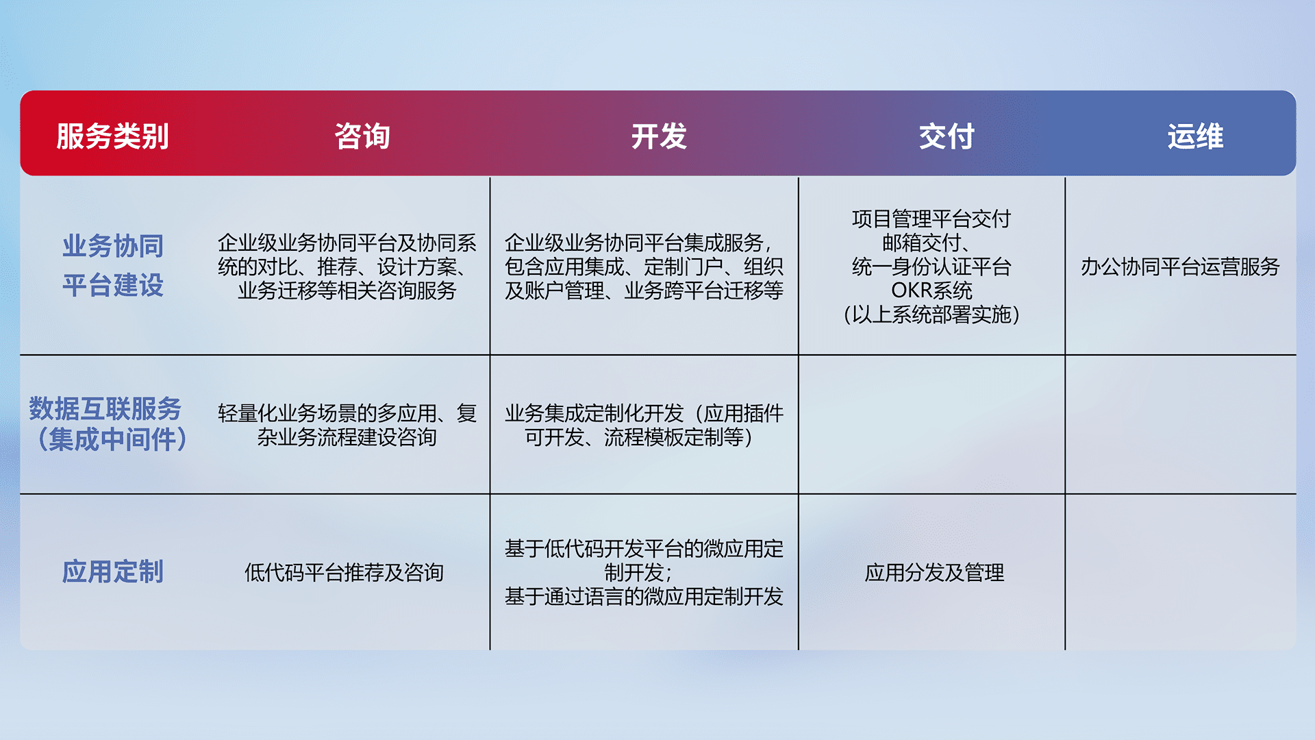 针对钉钉、、、企微、、IDaas等平台级产品提供产品的规划、、、、方案、、、、交付、、定制化开发等服务,,,,实现如统一协同办公、、、、智能客户服务、、、、混合会议管理、、、智能数据查询、、等业务场景,,实现数字化转型。。